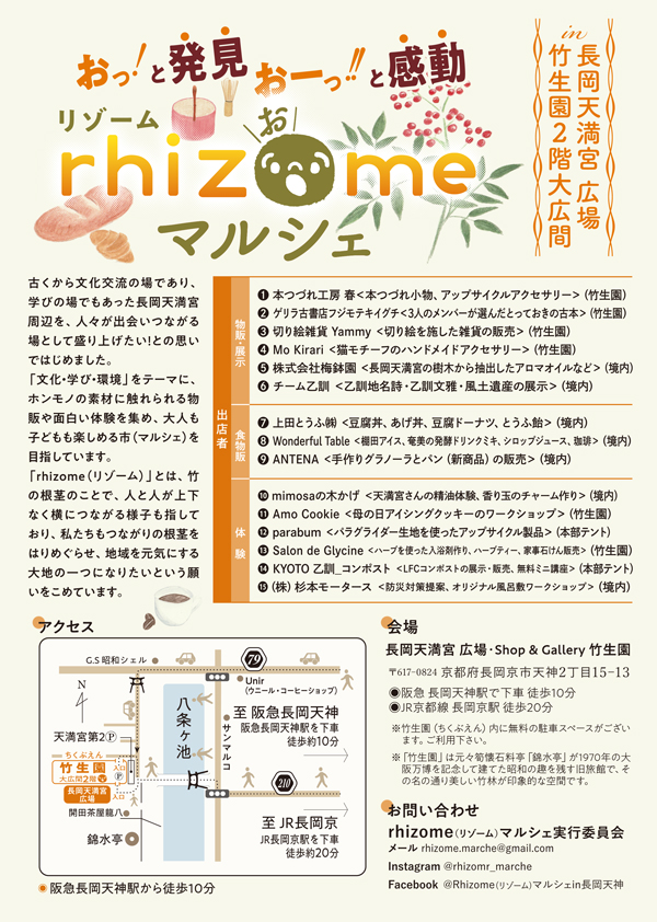 5月13日(土)RHIZOMEマルシェ ワークショップ開催のお知らせ 2023年5月5日 日時2023年5月13日 土曜日 10:00~16:00場所長岡天満宮 広場 Shop & Gallery 竹生園京都府長岡京市天神2丁目15-13お問い合わせrhizome(リゾーム)マルシェ実行委員会メール:rhizome.marche@umebachien