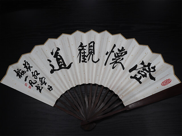 クライアントが「 澄懐観道」と直筆で書いた扇子をプレゼントしてくれ「 心を澄ませば道が 開いていく」という庭を通じた心の交流ができました。The client gave us a fan with the words "澄懐観道" written on it in his own handwriting, and we were able to exchange hearts through the garden, saying "If you clear your mind, the path will open up." It was truly a Zen state.